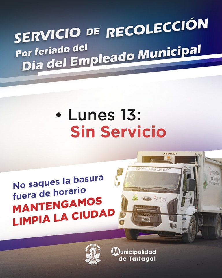 TE RECORDAMOS QUE HOY LUNES 13 NO HABRÁ SERVICIO DE RECOLECCIÓN DE RESIDUOS POR FERIADO DEL DÍA DEL EMPLEADO MUNICIPAL